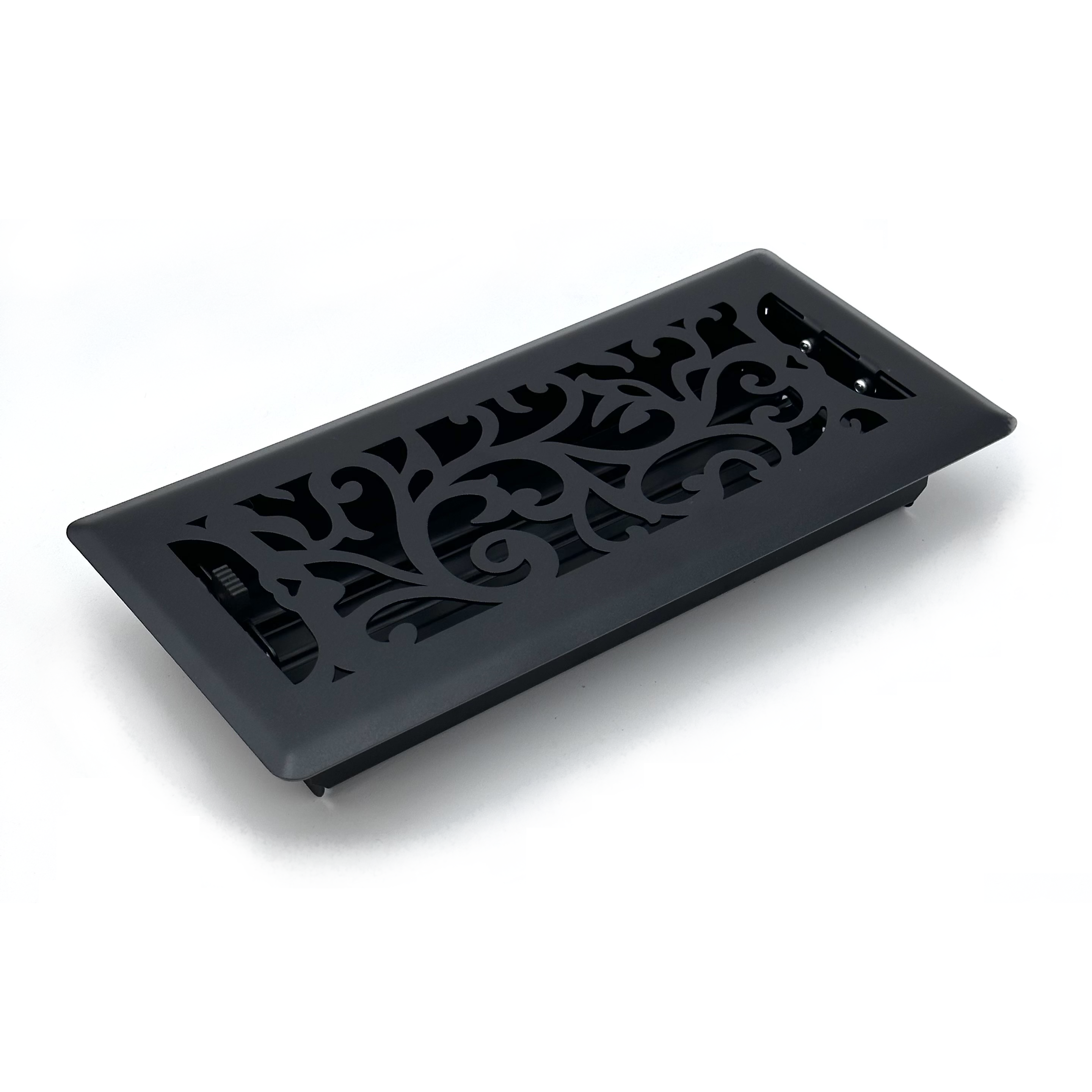 These Sierra Grates Floral Floor Registers have a beautiful Cast Iron Black Finish and are made of 100% steel. This product is designed to withstand foot traffic and has an adjustable damper that allows you to open and close airflow to your comfort level. The faceplate features a beautiful Floral design and the vent is made to fit a hole size that measures 4" x 10". The faceplate size is 1.5" larger than the listed size.