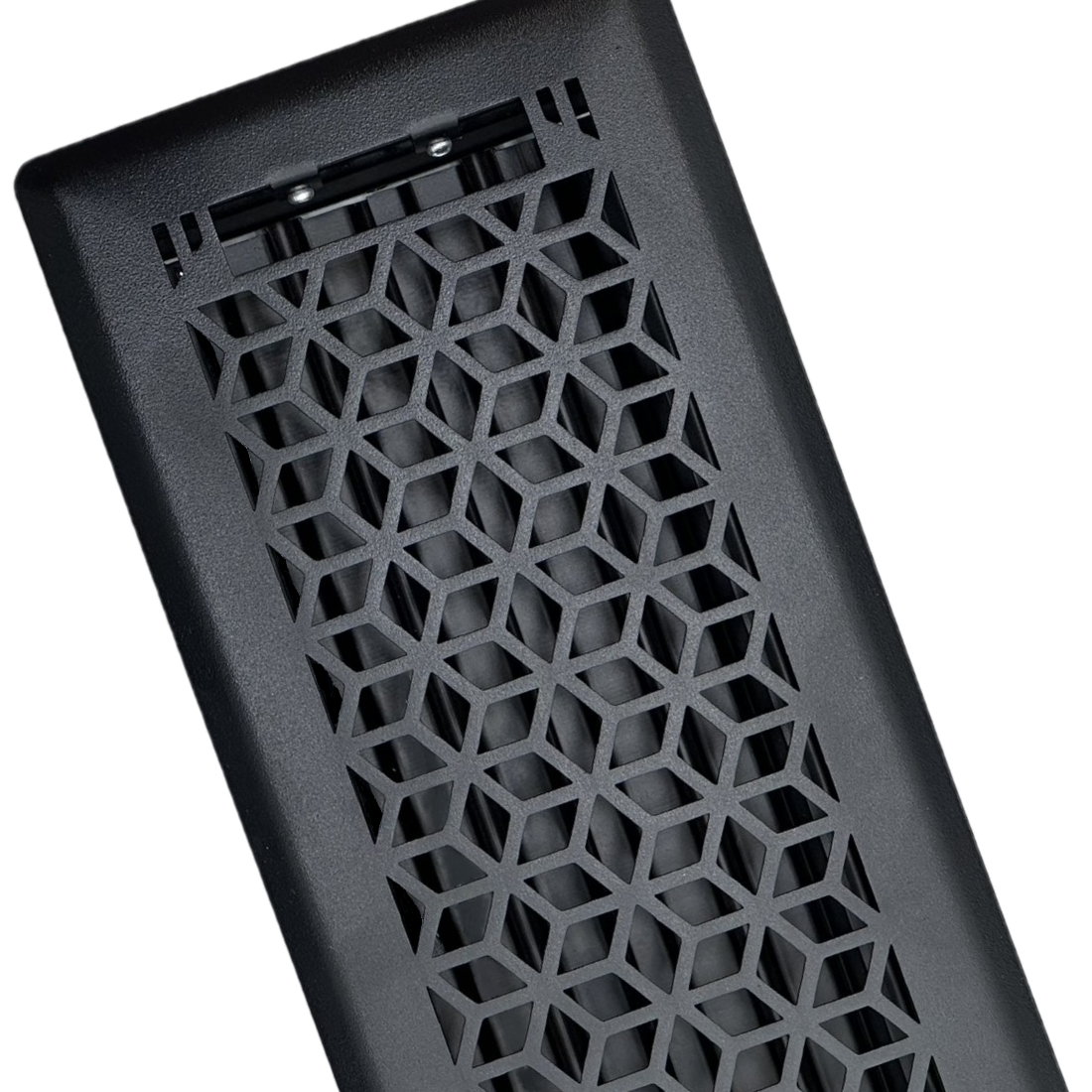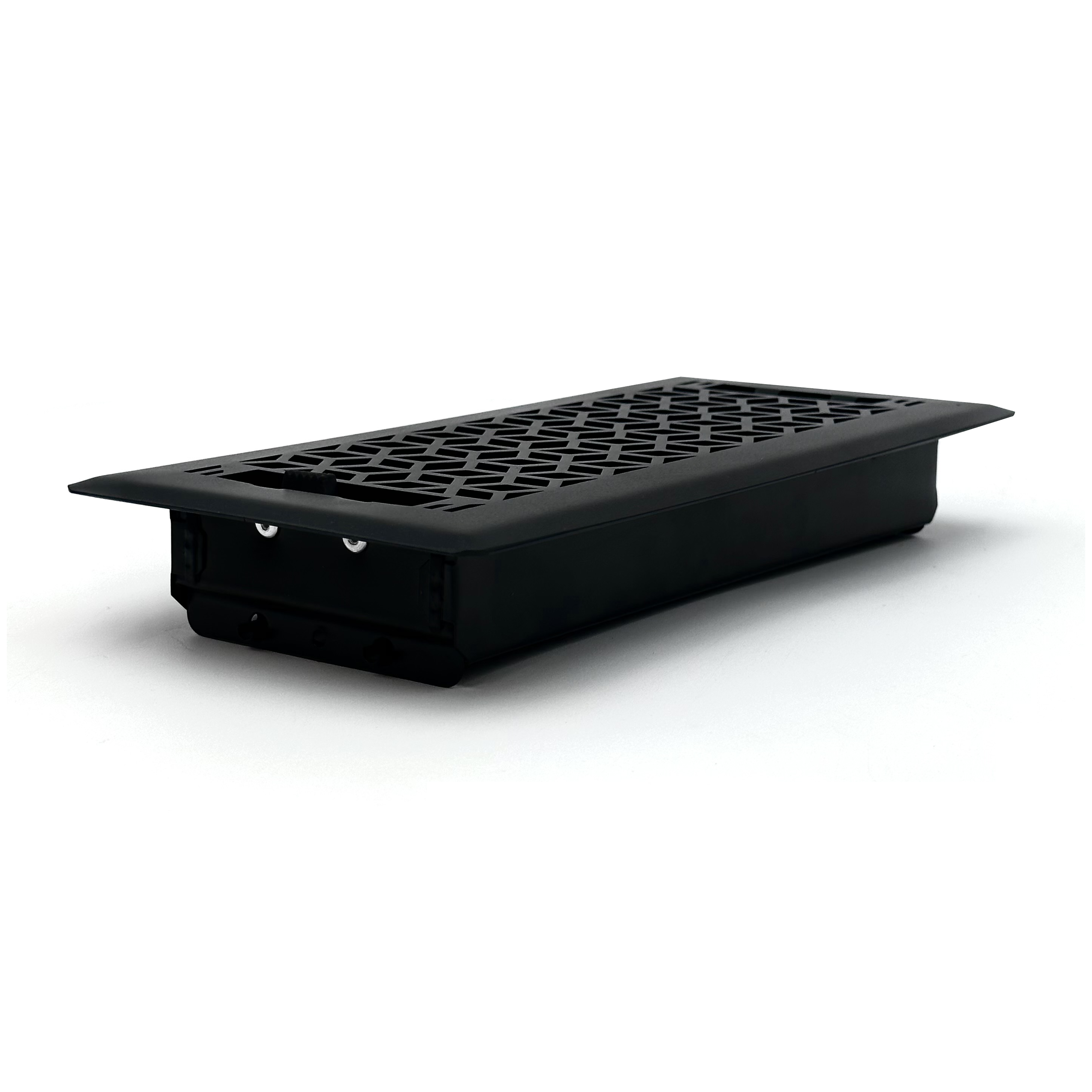 These Sierra Grates Vector Floor Registers have a beautiful Cast Iron Black Finish and are made of 100% steel. This product is designed to withstand foot traffic and has an adjustable damper that allows you to open and close airflow to your comfort level. The faceplate features a beautiful Vector design and the vent is made to fit a hole size that measures 4" x 10". The faceplate size is 1.5" larger than the listed size.