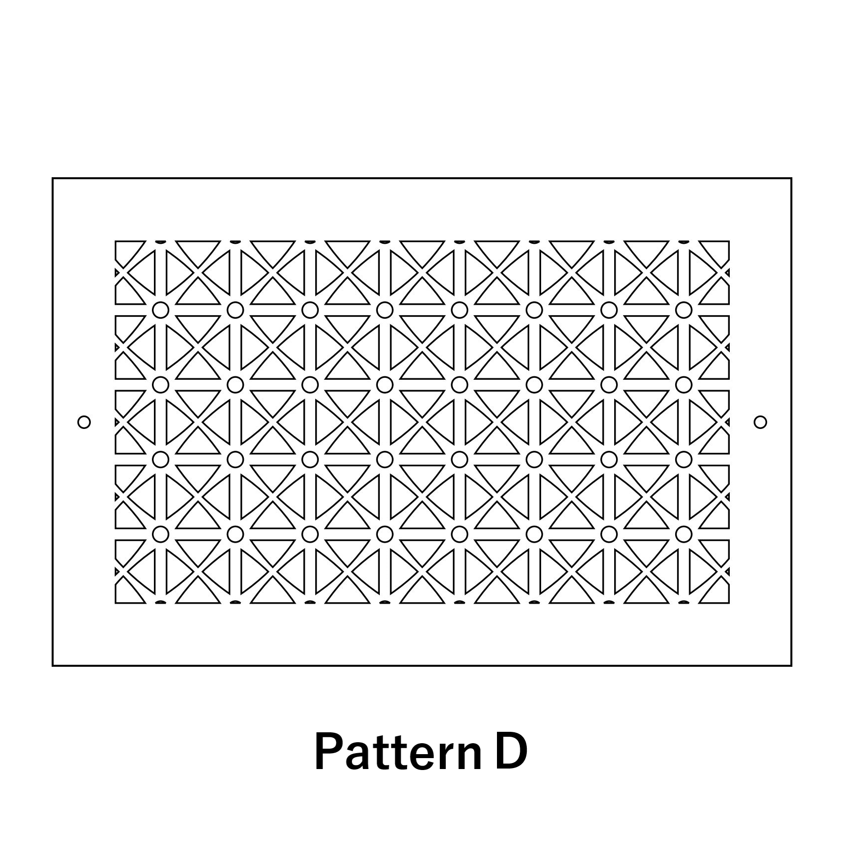 Pattern Cut decorative wall return air vents accentuate any room. They can be painted to match your walls or stained to match your trim. These decorative wall return air vents come in 26 different designs for you to choose from. They also come in 56 sizes, if you don't see the size you need listed in the drop down menu, call us at 800-504-5989 to get a quote. These wooden grilles are measured by the size of the duct opening in your wall. Measure your return air duct opening width x height. For example, if your duct opening is 10" wide x 6" high you would order a 10 x 6 return air grille. The actual faceplate of the grille will then be 1 3/4" larger (in this example the faceplate will be 11 3/4" x 7 3/4"). These grilles are constructed from a 1/4" thick Baltic Birch ply. For the face of the return air vent, you have the option of choosing between Maple, Oak, or a Cherry Veneer. If you will be painting the grille, the manufacturer recommends you select the maple veneer. They are shipped to you sanded and ready to be finished however you'd like. These decorative wall return air vents can be transformed into decorative wall or ceiling registers by purchasing the Adjustable Damper that is available in 21 of the Pattern Cut sizes.