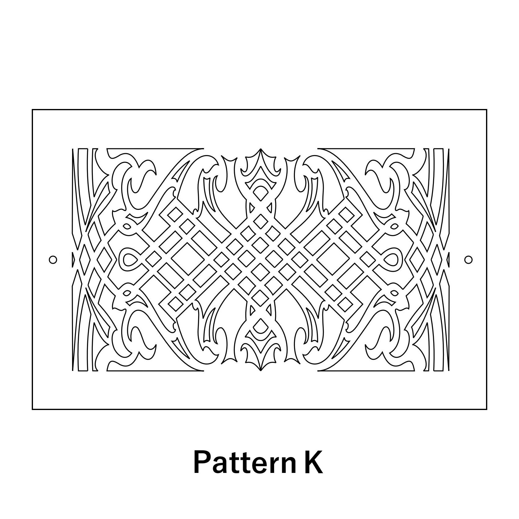 Wood return decorative wall grilles by Pattern Cut, Inc are customized to fit your needs. These grilles must be cut to order because of the many options so please allow five business days before your order ships. These wood return decorative wall grilles come in 56 sizes, 26 designs, and 3 wood veneers (Oak, Maple, Cherry). The grille is made of baltic birch ply. If you plan to paint your grille, the manufacturer has recommended the maple veneer. You also have the option of having your grille with or without pre-drilled screw holes. To order the correct size, go to the drop down menu that says "Size/Price" and select the size you measured (if the hole in your wall is 12" wide x 6" high, select the size 12 x 6). Hint: The overall faceplate dimensions of the decorative air return wall grille will be 1 3/4 inches larger than the size listed. Example: 12" x 6" duct opening will have a faceplate size of 13 3/4" x 7 3/4". The grille has an approximate 1/4" faceplate thickness.