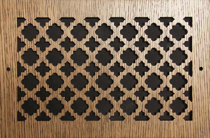 Pattern Cut wood return wall vents have intricate designs. You have the option of choosing between 26 different patterns. These wood return wall vents are cut by a laser leaving accurate and identical parts. We offer 56 standard sizes on our website, if you do not see the size or shape you need, give us a call at 800-504-5989 and we'll quote you a price for a custom size. These wood return grilles are constructed from 1/4" Birch ply and have a veneer face of Maple, Oak, or Cherry. They are shipped to you sanded and ready to be either stained or painted.