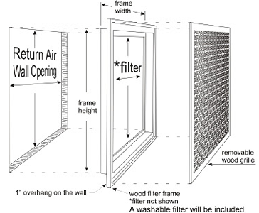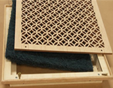 Each Pattern Cut wood filter grille includes a filter frame (that is installed in the opening) that holds the included 1" filter and removable filter door that is held into place with brass thumb screws. This way you have easy access to the filter compartment when changing of the filter is needed.