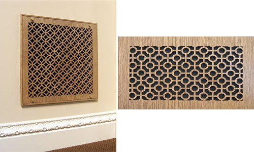 These decorative wood filter grilles by Pattern Cut, Inc replace dingy, damaged white steel return filter grilles. The wood return air grilles are manufactured from 100% laminated birch hardwood with a veneered face. You can add style to any room while trapping harmful dust and particles in your HVAC system. You have your choice between three unfinished veneers: oak, maple or cherry. If you anticipate on painting the grille, the manufacturer recommends the maple veneer. These decorative wood filter grilles, however, can be painted to match your walls or stained to match your trim. They come sanded and ready for you to finish however you'd like. On top of the 56 different sizes these wall grilles come in, Pattern Cut, Inc also offers custom sizes. Just call 1-800-504-5989 for a quote.