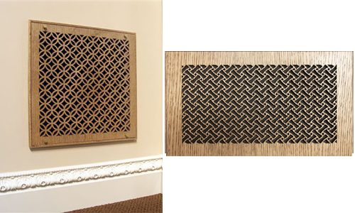 Pattern Cut decorative Filter Grilles accentuate any room. They can be painted to match your walls or stained to match your trim. These filter grilles come in 26 different designs for you to choose from. They also come in 56 sizes, if you don't see the size you need listed in the drop down menu, call us at 800-504-5989 to get a quote. These wooden grilles are measured by the size of the duct opening in your wall. Measure your return air duct opening width x height. For example, if your duct opening is 10" wide x 6" high you would order a 10 x 6 return air grille. The actual faceplate of the grille will then be 2" larger (in this example the faceplate will be 12" x 8"). These grilles are constructed from a 1/4" thick Baltic Birch ply. For the face of the return air vent, you have the option of choosing between Maple, Oak, or a Cherry Veneer. If you will be painting the grille, the manufacturer recommends you select the maple veneer. They are shipped to you sanded and ready to be finished however you'd like.
