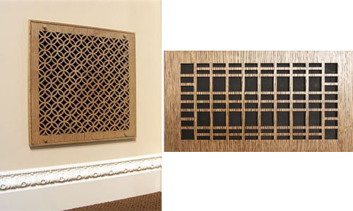 Pattern Cut decorative Filter Grilles accentuate any room. They can be painted to match your walls or stained to match your trim. These filter grilles come in 26 different designs for you to choose from. They also come in 56 sizes, if you don't see the size you need listed in the drop down menu, call us at 800-504-5989 to get a quote. These wooden grilles are measured by the size of the duct opening in your wall. Measure your return air duct opening width x height. For example, if your duct opening is 10" wide x 6" high you would order a 10 x 6 return air grille. The actual faceplate of the grille will then be 2" larger (in this example the faceplate will be 12" x 8"). These grilles are constructed from a 1/4" thick Baltic Birch ply. For the face of the return air vent, you have the option of choosing between Maple, Oak, or a Cherry Veneer. If you will be painting the grille, the manufacturer recommends you select the maple veneer. They are shipped to you sanded and ready to be finished however you'd like.